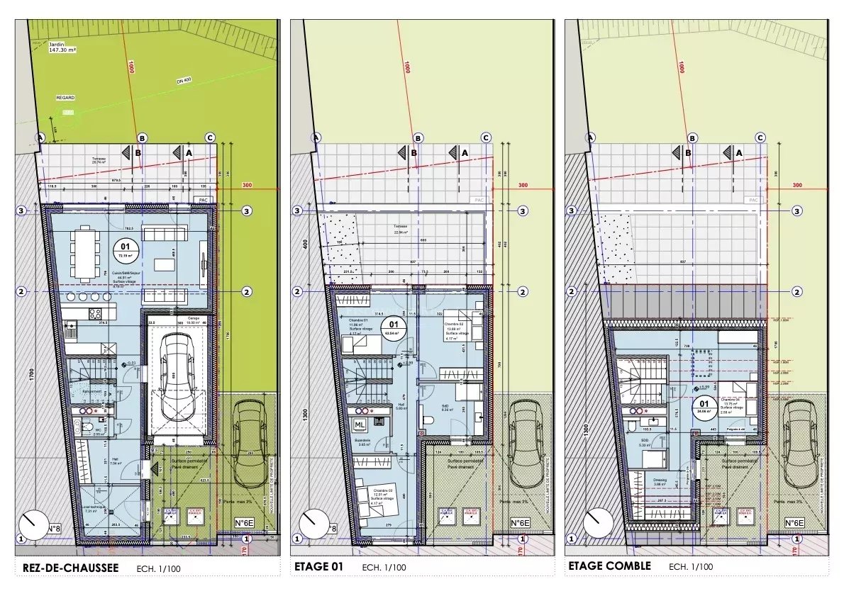 Nous vous proposons 5 maisons jumelées – 2 ou 3 façades - chacune disposant de 4 chambres, de terrasses et d’un beau jardin.